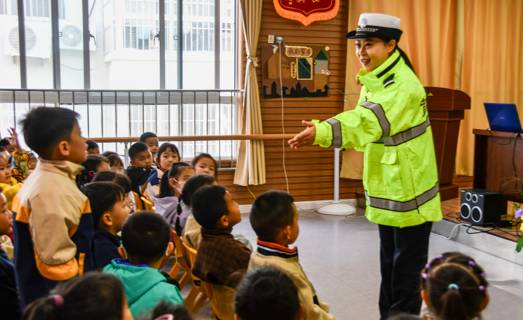 为切实加强学龄前儿童交通安全启蒙教育,提升幼儿自我保护意识与文明出行素养。3月31日,黄龙县公安局交通管理大队组织民警走进水磨坊幼儿园,为大班小朋友带来一场生动有趣、寓教于乐的交通安全主题宣讲活动。