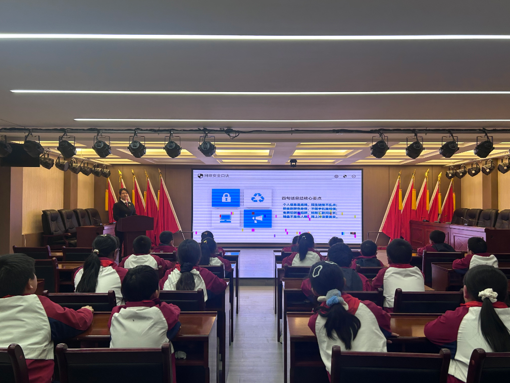 针对当前未成年人网络使用日益频繁、网络安全风险增加的现状,未检办工作人员结合办案实践,为学生们精心准备了一场网络安全知识专题讲座。讲座以“学网络世界‘防身术’ 做数字时代‘小主人’”为题,立足小学生认知特点,摒弃枯燥法条,以互动提问开场:“大家平时上网喜欢做什么?”“有没有遇到过游戏中陌生人送装备?”迅速拉近与学生的距离。工作人员结合近年来办理的涉未成年人网络诈骗、个人信息泄露等真实案例,以案释法,剖析网络沉迷危害、网络社交陷阱及隐私保护要点。“免费的皮肤不能信,陌生的链接不要点,屏幕背后的‘小姐姐’可能是大汉!”幽默风趣又直击要害的讲解,赢得阵阵掌声。