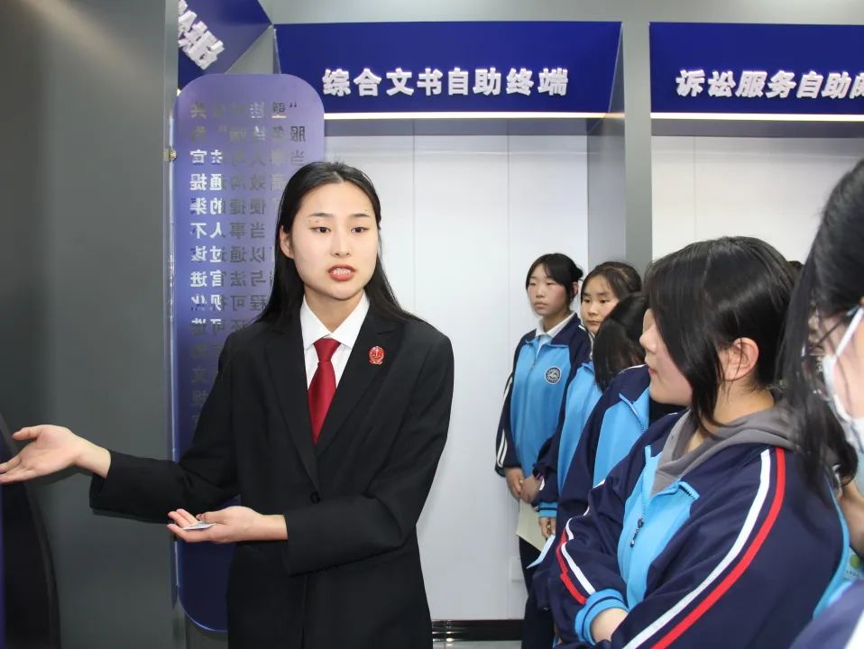 在讲解员的带领下,学生们参观了功能齐全的诉讼服务大厅,厅内的智能化设备更是让学生眼前一亮,认真聆听智慧法院建设、智能化立案及各项便民服务设施讲解,全面感受智慧法院建设成果。随后学生们参观了院内的调解室、远程视频法庭及审判法庭,更直观地了解审判设施用途、庭审程序及法庭纪律等,进一步熟悉法院的日常审判工作。