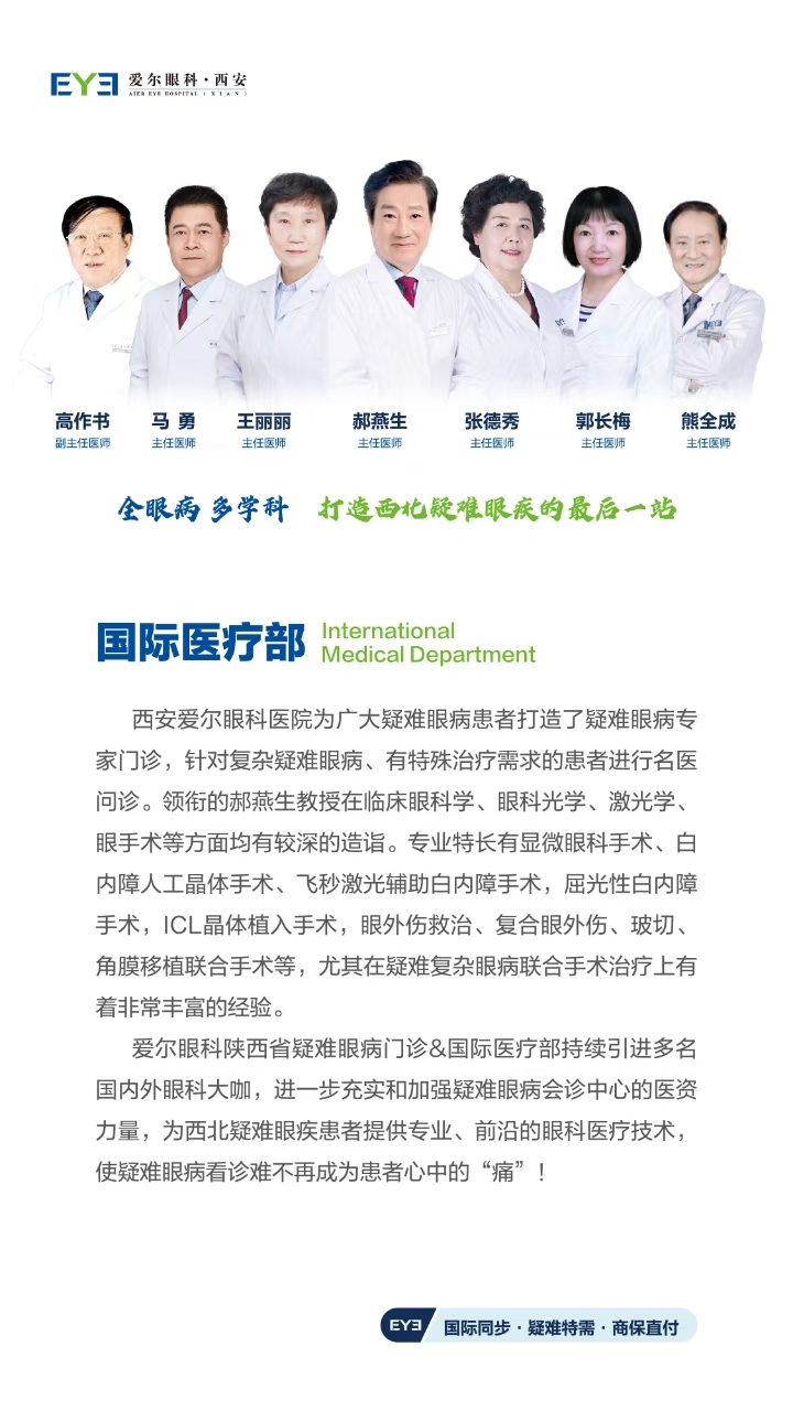 西安爱尔眼科医院由中国名医百强榜眼科白内障专业组榜首郝燕生教授领衔、享受国务院特殊津贴专家王丽丽、陕西省医学会眼科分会白内障学组组长马勇、原西京医院小儿视光学科带头人郭长梅、爱尔眼科集团省区屈光学组组长、西安市劳动模范郭永红等带领一批专业的医护人员组成的专业技术团队,确保患者在西安爱尔眼科医院能享受到顶尖的诊疗服务。