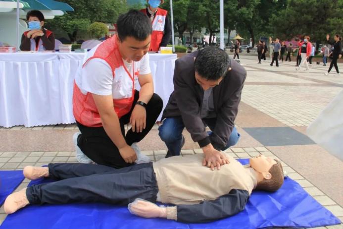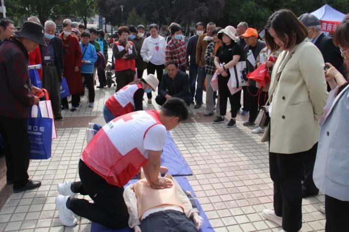 活动当天,渭南市红十字会安排了丰富多彩、形式多样的宣传活动。首先红十字会应急救护讲师向群众讲解了心肺复苏术、海姆立克急救法等常见的急救技能,并现场演示了操作流程。讲解结束后,工作人员还邀请市民亲手实践操作,手把手进行指导,帮助市民掌握正确的急救技能。