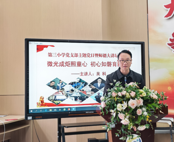 讲堂上,学校党支部委员、市级教学能手吴科老师以《微光成炬照童心 初心如磐育新人》为题分享育人历程。他围绕“脚步丈量基层,汗水浇灌希望”实践,讲述了扎根基层自制教具、家访助学、深夜护生病学生、创新“趣味数学实践课”等感人故事。十三载春秋,从青涩特岗教师到教学骨干的蜕变,吴科用行动诠释了新时代教师的责任担当与党员先锋本色,引发全场强烈共鸣。教师们纷纷表示,将教育理想融入日常教学,让每个孩子感受教育的温度与力量。
