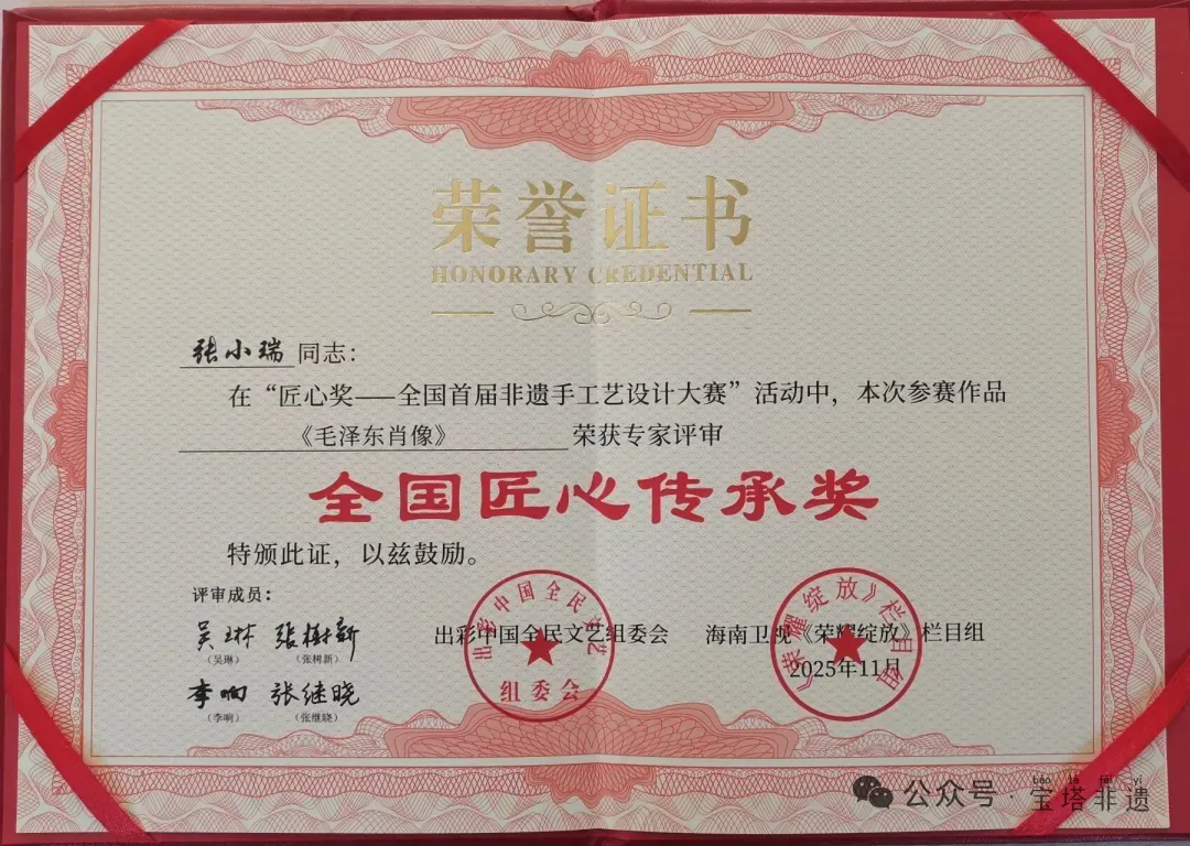 近日,全国首届非遗手工艺设计大赛落下帷幕,非遗传承人张小瑞凭借参赛作品《毛泽东肖像》,经出彩中国全民文艺组委会、海南卫视《荣耀绽放》栏目组联合评审,荣获“全国匠心传承奖”,为延安市非遗事业再添国家级荣誉。