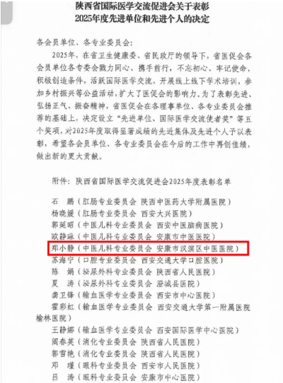 近日,从陕西省国际医学交流促进会传来喜讯,汉滨区中医医院儿科郑小静荣获2025年度“专业委员会先进个人”称号。这不仅是她个人的荣誉,更是对该院儿科团队坚持中西医结合、深耕儿童健康事业的高度认可。