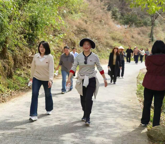 活动当天,阳光和煦,微风拂面。女干部们精神抖擞、神采飞扬,早早在镇政府门口集结待命,脸上洋溢着期待与喜悦。随着活动启动指令发出,大家迈着矫健的步伐有序出发,沿着既定路线稳步前行。行进过程中,大家不分岗位、不分年龄,或并肩畅谈工作心得,分享生活感悟;或相互鼓励、彼此搀扶,攻克山路陡坡的难关;或驻足欣赏沿途春日风光,感受渔渡镇的山水之美与发展变迁,欢声笑语回荡在山间小道,成为春日里一道亮丽的风景线。