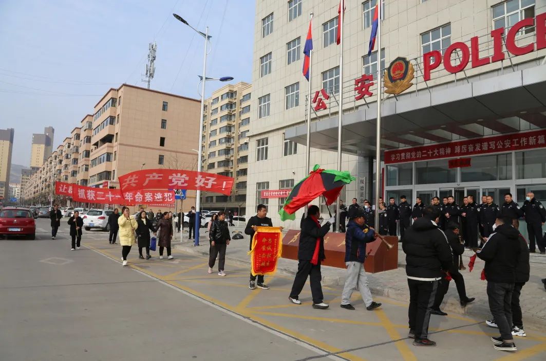 2月23日上午,“2001·6·19”故意伤害致人死亡案被害人家属李某一行十余人,将印有“忠诚担当 命案必破”的锦旗和“共产党好!”、“抓获二十一年命案逃犯”、“让群众感受到公平正义”的横幅送到绥德县公安局办案民警手中,感谢绥德公安抓获潜逃21年命案逃犯,维护法律权威,还受害人以公道。