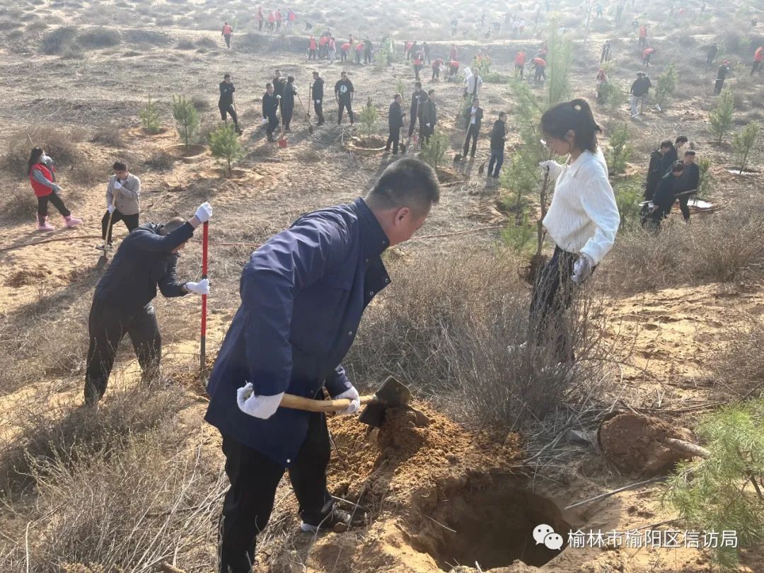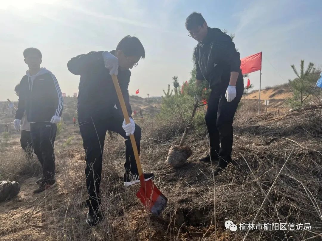 3月31日上午,榆阳区信访局全体党员干部来到小纪汗林场植树基地开展义务植树活动。