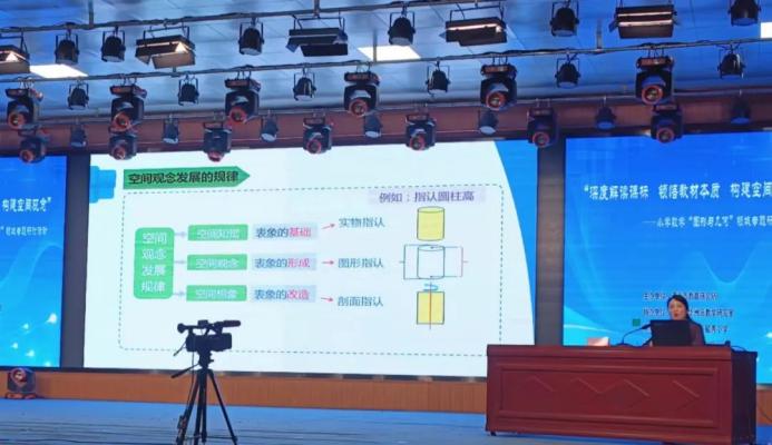 渭南市教育研究所王艳主任以“有效落实课标理念 培养学生空间观念”为题,从新课标对空间观念教学的要求、困扰学生空间观念发展的原因、发展学生空间观念的有效策略三个方面阐述了如何在教学中培养学生的空间观念。她强调作为新时代的数学教师在课堂教学中应做到:聚焦科学素养,深耕课堂教学,优化教学策略,提升学习能力,带领学生发现生活中的数学知识,感悟数学之美。