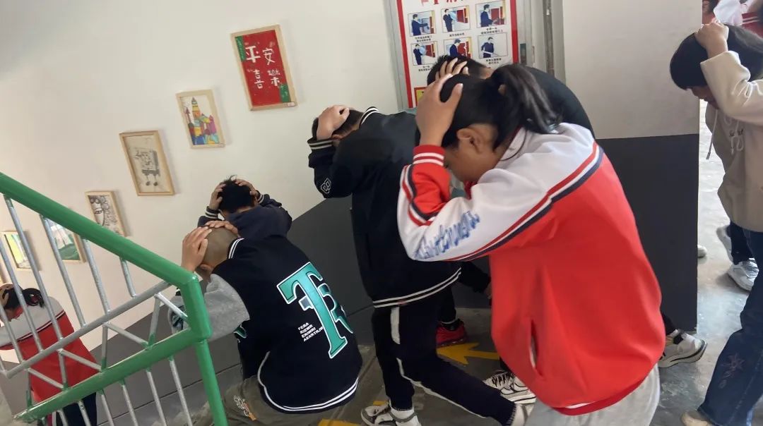 随着第一次警报声的响起,应急演练活动正式开始,各班学生迅速双手抱头躲在课桌下方蜷曲身体,降低身体重心,进行紧急避险。并在老师的组织下,按照安全疏散路线,快速撤离到学校操场,到达指定的区域后,各班班主任迅速清点并报告人数,确认参与演练学生安全且全部到齐后,立即向现场指挥汇报情况。