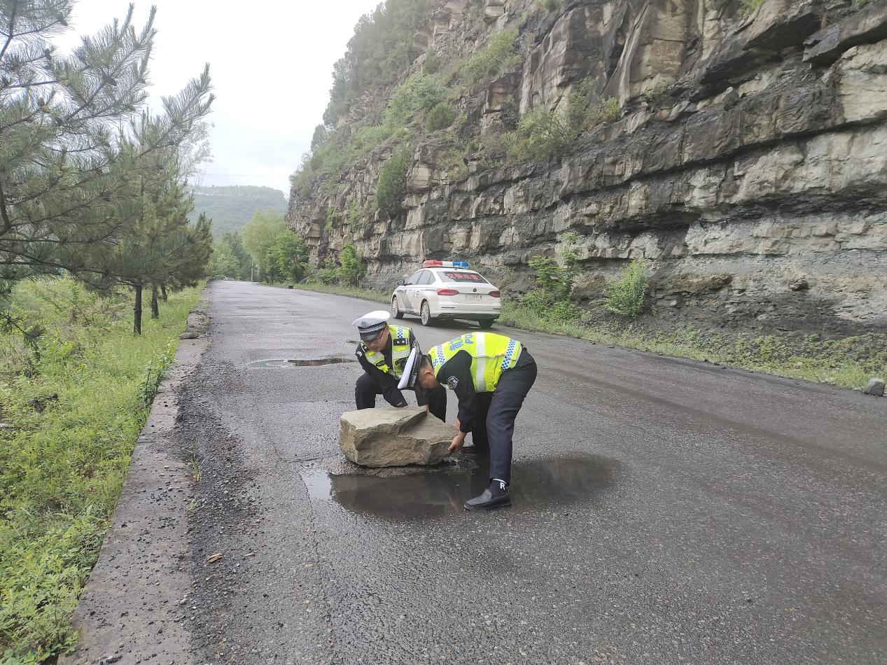 工作中,民警结合当前辖区道路实际,对事故多发点路段、重要路口、急弯路段和连续下坡等隐患重点路段,逐一排查,清除降雨导致的落石,做好滑坡点警戒标识标记,保证过往车辆人员安全。