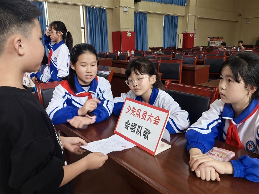 本次活动围绕“六知、六会、一做”展开,内容涵盖少先队的基本知识与实践能力。采用“闯关打卡”形式,设置多个趣味关卡,如“知识问答站”“队礼展示台”“队歌我会唱”“我为红领巾添光彩”等,由高年级少先队员和辅导员共同担任考官,寓教于乐,营造积极向上的氛围。