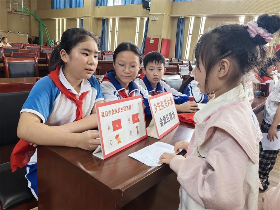 近日,汉阴县蒲溪镇中心小学大队部组织开展了“争做新时代好少年”新少先队员入队知识大闯关活动,将队章知识与沉浸体验深度融合,为新队员们加入少先队做好充分准备,激发他们对少先队组织的向往和热爱。