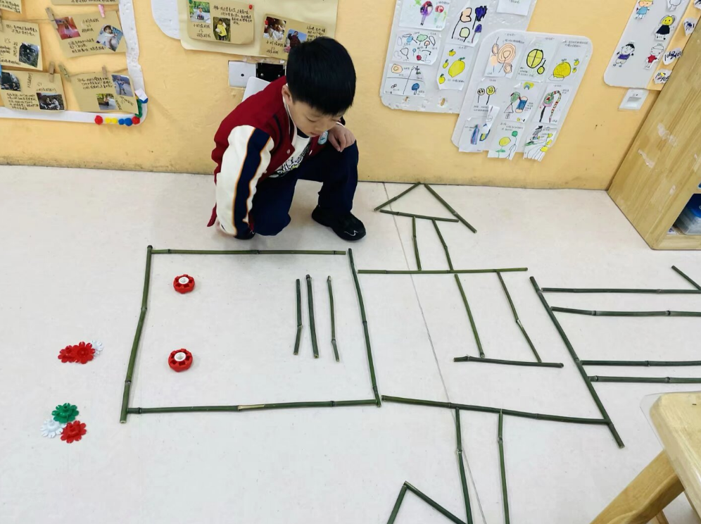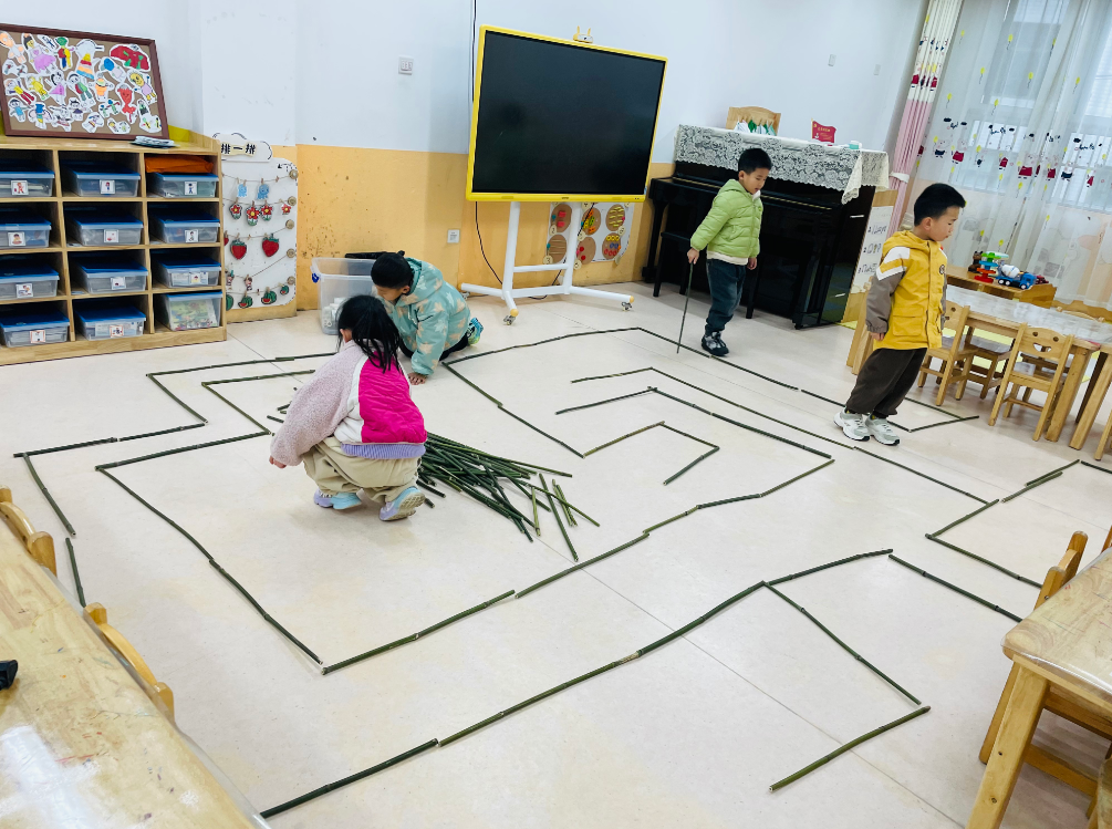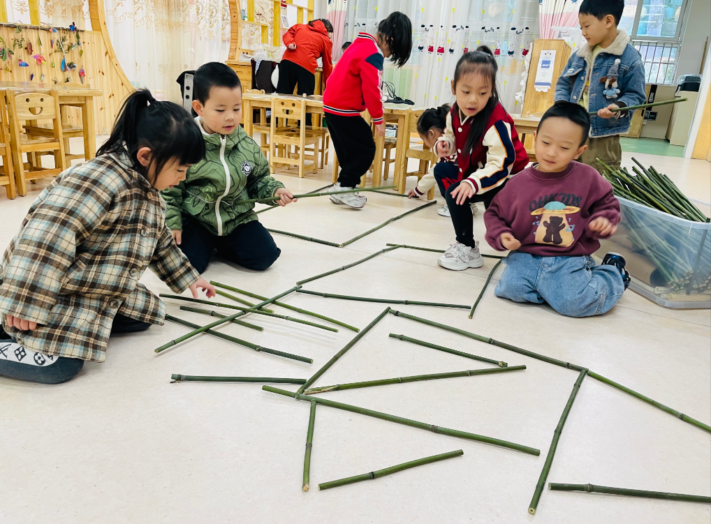活动中,孩子们的探索紧扣课程目标展开,拼搭“房屋”“迷宫”时,不仅锻炼手部精细动作与空间建构能力,更自然渗透数学领域“形状与结构”“数量与排序”知识;用彩色玩具点缀竹屋“门窗”环节,又融入艺术色彩搭配与创意表达,让“自然材料”变身直观可感的“活教具”。龙头竹是镇坪本地常见的野生竹种,其竹节小巧、质地轻便的特点,恰好契合幼儿的操作需求与探索兴。
