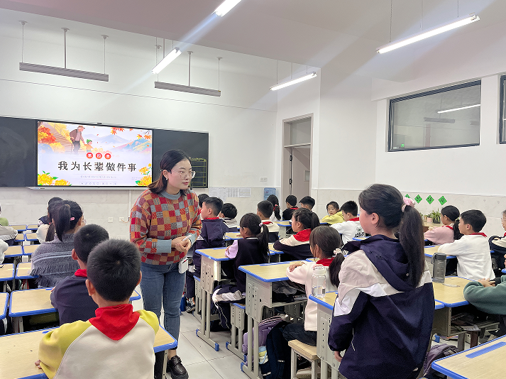 该校通过升旗仪式拉开活动序幕,学生代表以“重阳节与感恩”为主题进行国旗下讲话,分享登高、赏菊、敬老等重阳习俗,向全校同学发出用行动致敬长辈的倡议。班队会上,中队辅导员借助图片、短视频,生动讲解“九九重阳”的寓意、传统习俗及现代敬老意义;学生们踊跃分享“我和长辈的温暖小事”,用真挚语言传递对长辈的感恩之情。广播站则科普“敬老小知识”,从“如何礼貌帮长辈做家务”到“和长辈聊天的小技巧”,为学子们的孝亲行动提供实用指引。