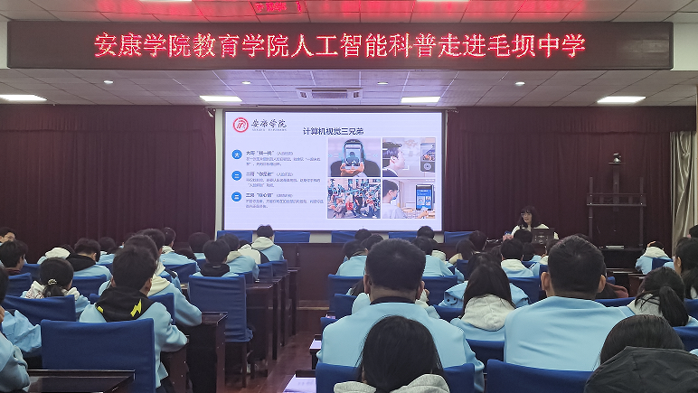 活动中,毛坝中学科技副校长、安康学院金国竹老师为师生们带来《AI就在你身边》的主题科普讲座。她以“AI视觉三兄弟”为切入点,用“找一找”“你是谁”“啥心情”等趣味表达,将抽象的人工智能技术具象化。现场组织学生开展“最强大脑”挑战游戏,同学们踊跃上台,参与人脸特征识别互动,在欢声笑语中领会人工智能识别的逻辑,现场气氛持续升温。现场还播放了《科普中国》视频,从操作到理论的具象化,以“实践+学习”的完整体验,带动全体师生体验科技的魅力。