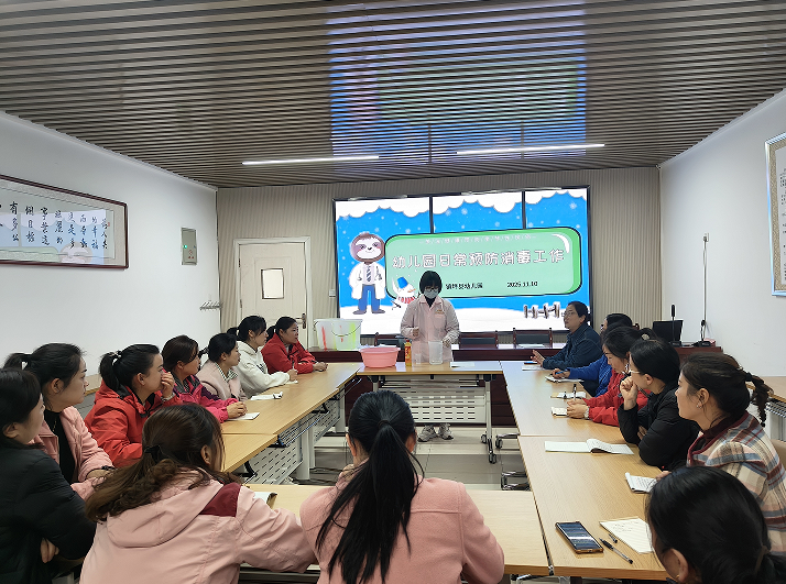 演练前,幼儿园组织全体保育员进行培训指导。保健医生结合秋冬季节流感高发特点,重点讲解流感的传播途径、典型症状、预防措施及应急处置关键环节,并对演练人员进行岗位分工,确保演练时反应迅速、操作有序。