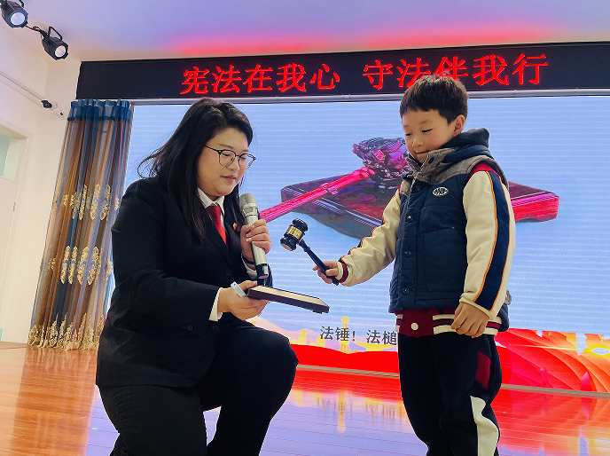 最受期待的“小法官体验”环节中,孩子们排着队穿上法袍小心翼翼地触摸法槌。“现在开庭!”随着稚嫩的声音响起,法槌“咚”的一声轻敲桌面,现场瞬间安静下来——孩子们挺直小身板,眼神里满是认真与庄重。6岁的雯雯穿好法袍后,还学着干警的样子整理了衣领:“我现在是法官啦,要保护小朋友!”