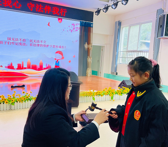 活动现场,干警刘茜先用卡通动画和趣味问答,向孩子们介绍了宪法的“根本大法”地位,以及国旗、国徽的象征意义。当干警出示法徽时,孩子们纷纷举手问到“这个徽章上的天平是什么呀?”“这代表公平公正,就像小朋友分糖果要一样多哦!”生动的比喻让孩子们瞬间理解了法徽的含义。