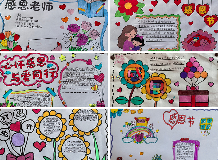 此外,各班还分别通过办感恩手抄报、撰写感恩主题征文、制作感恩贺卡、学生在家为父母亲人做一件泡茶、捶背揉肩等尽孝心感恩体验之事,感知感恩,感悟感恩,在感恩中成长。