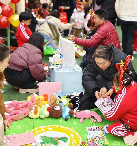 集市上,孩子们化身“小小摊主”,和家长一起精心布置摊位,毛绒玩具、绘本图书、手工制品等琳琅满目的商品整齐摆放,一个个创意十足的小摊位成为园内独特的风景线。“快来买呀,我的玩具超有趣!”“这个绘本只要两块钱!”孩子们大胆吆喝、主动推销,在讨价还价中锻炼了语言表达和社交能力;也有小朋友化身“小顾客”,穿梭在各个摊位间认真挑选,体验挑选与交换的快乐。家长们则在一旁陪伴指导,现场欢声笑语不断,处处洋溢着温馨与热闹。