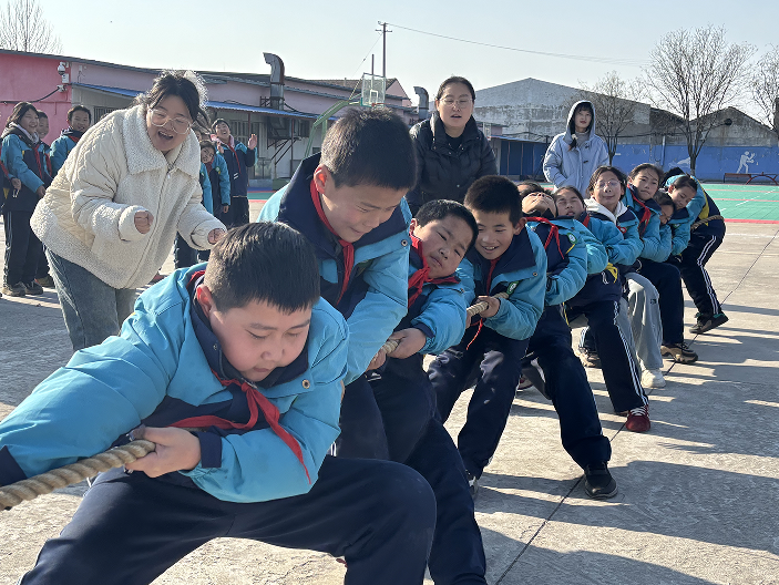 操场上锣鼓喧天,呐喊声震耳欲聋,元旦拔河比赛燃情开赛。各班参赛队员紧握长绳,脚蹬实地、身体后倾,眼神坚定、拼尽全力,每一个动作都凝聚着团队的力量;场外啦啦队挥舞着小旗帜,“加油!加油!”的呐喊声此起彼伏,成为队员们最坚实的后盾。队员们心往一处想、劲往一处使,用汗水诠释“团结就是力量”,用坚持展现“永不言弃”的精神,师生在热血拼搏中收获了友谊与快乐,更懂得了协作与担当。