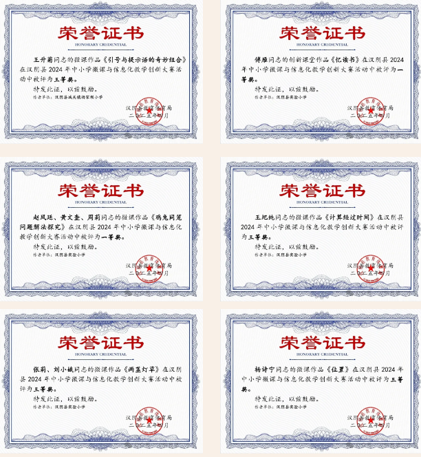以赛促用显成效:组织教师积极参与市县中小学微课与信息化教学创新大赛、影视教育等活动。在安康市第九届中小学微课与信息化教学创新大赛中,傅雁、赵风廷、黄文查、周莉等4名教师的作品荣获市级二等奖;在汉阴县相关赛事中,4名教师获一等奖、9名教师获三等奖,学校获评“优秀组织单位”。此外,在2024年度影视教育活动作品评选结果通报中,17名学生影评作品分获县一、二、三等奖,3名教师获评“优秀指导老师”,校本部及杨家坝分校获评影视教育“先进工作单位”;在县教研室关于表扬2024-2025学年度全县教育系统电教工作通报中,学校获评全县电教工作“先进单位”,张涛老师获评“先进个人”。