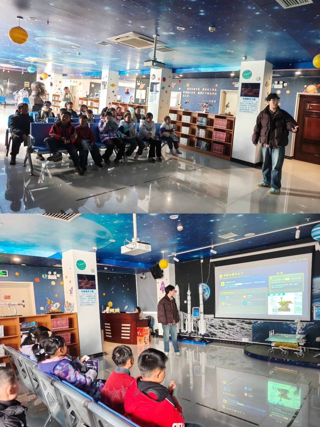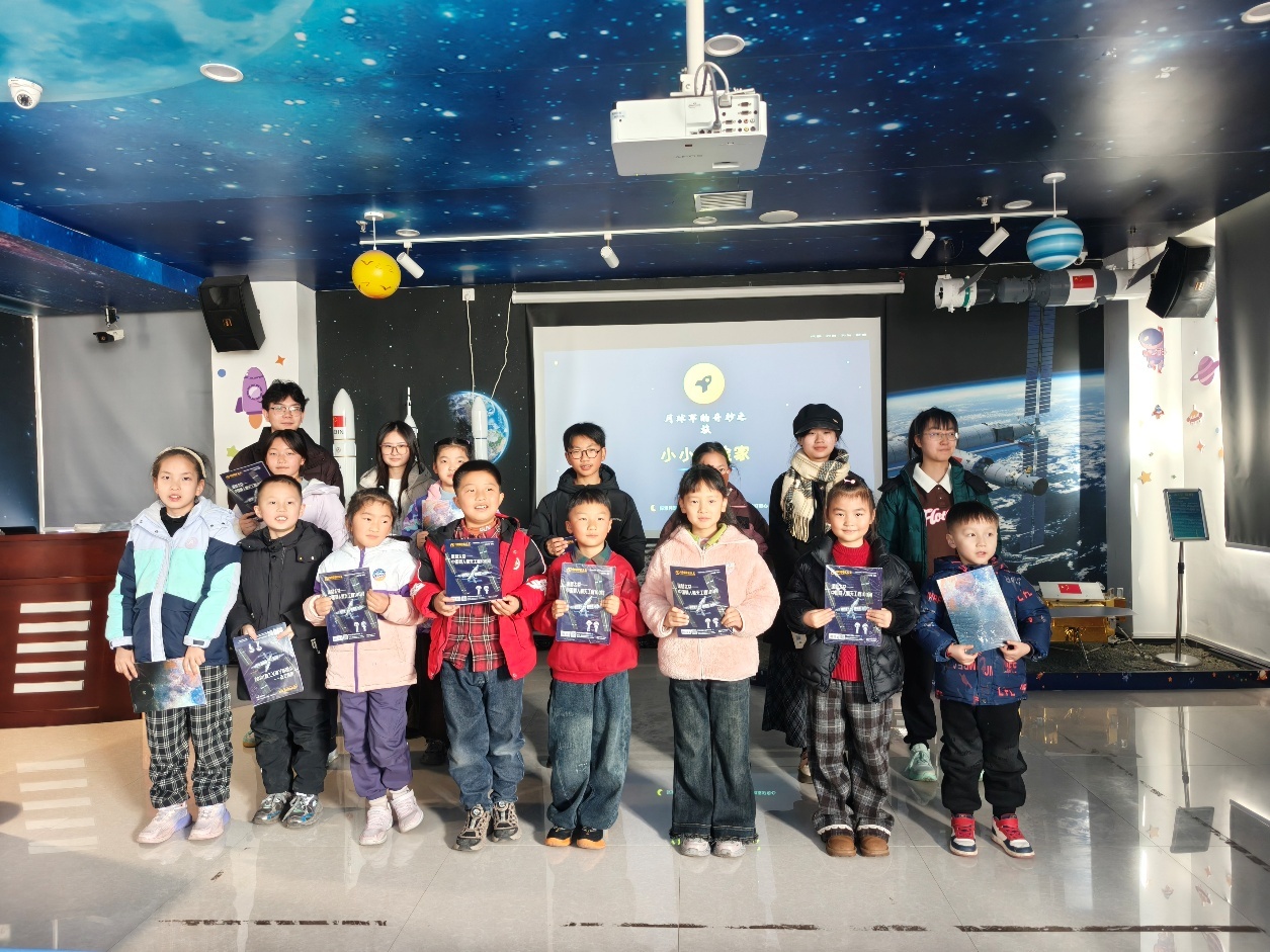 本次活动特别邀请了陕西理工大学的学生志愿者王智毅,为孩子们带来了以“小小月球探险家”为主题的科普课堂。志愿者用通俗易懂、生动有趣的语言,详细讲解了我国探月工程中的玉兔号月球车,从月球车如何抵抗月球上的极端温差,到在松软崎岖的月壤上平稳行驶,再到精准探测月球资源、传回珍贵数据,一个个实用又厉害的本领被一一揭开,让孩子们真切感受到中国航天科技的实力与独特浪漫。