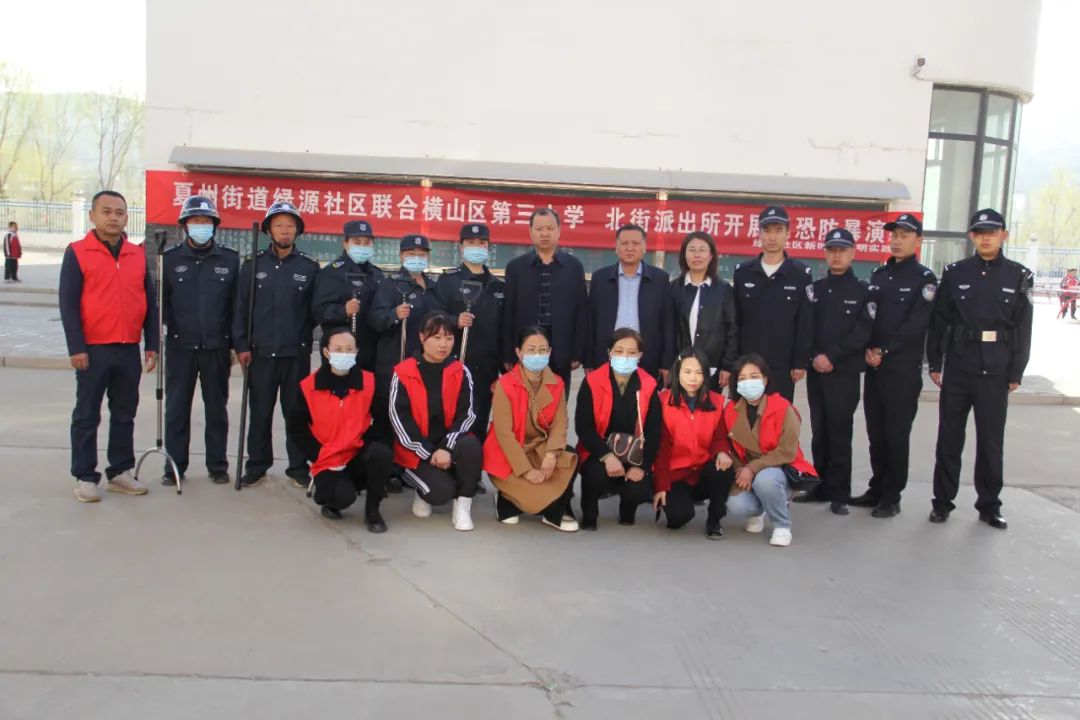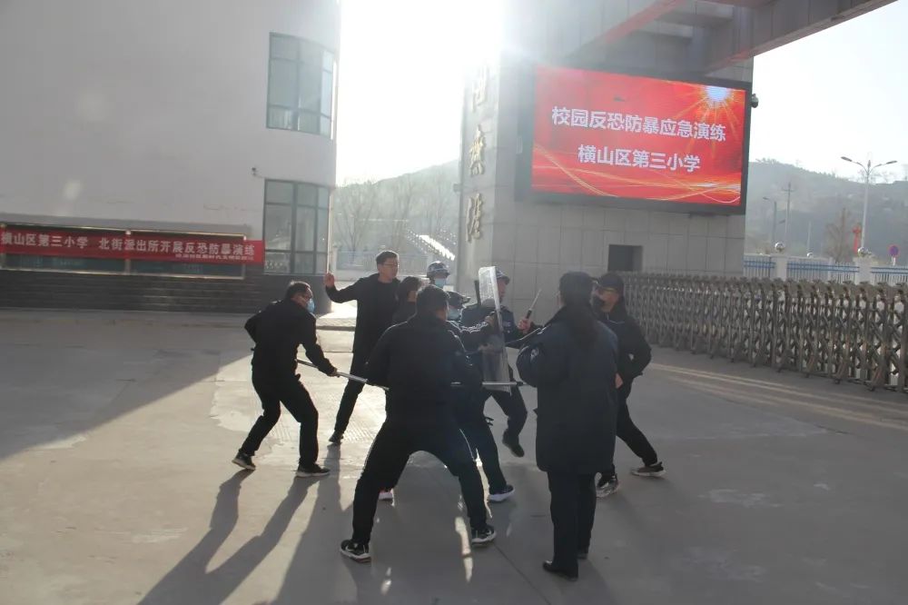 为维护师生生命安全,应对校园恐怖袭击事件,提高应对暴恐事件的有效处置、自护自救能力,确保学校师生的人身安全,努力实现”平安校园”的总体工作目标,榆林市横山区第三小学在法制副校长拓彩平的策划指导下,于3月29日联合北街派出所和绿源社区开展了一次校园反恐防暴应急演练。