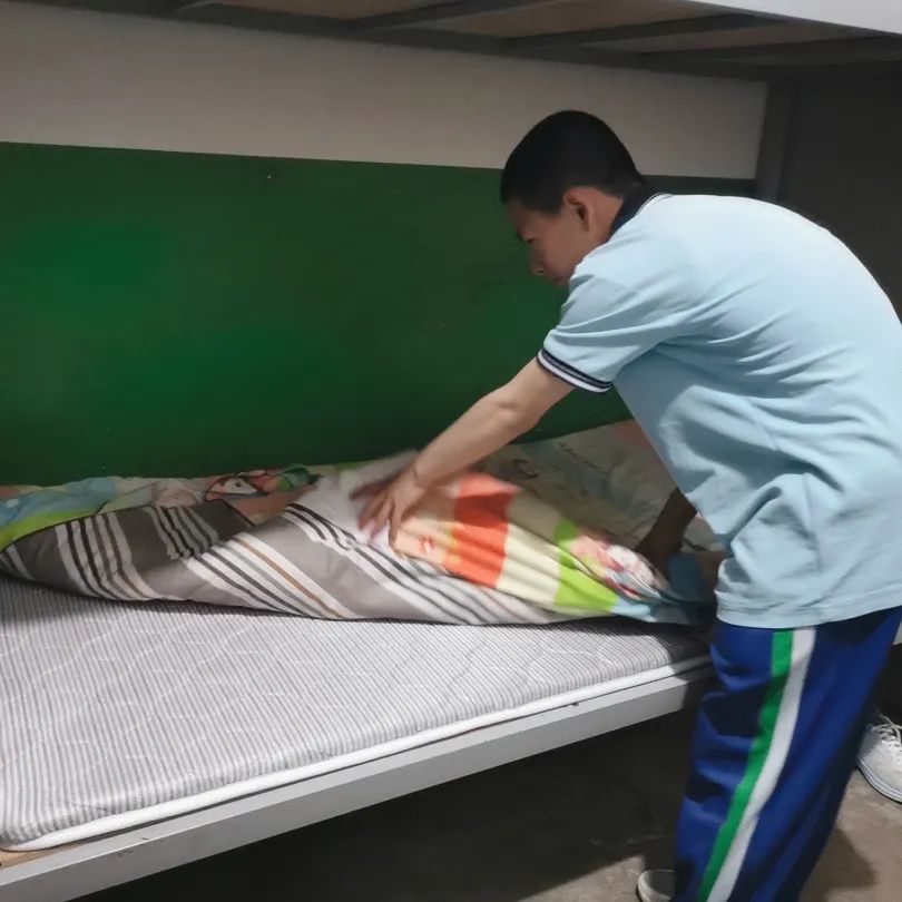 晚上,老师们照例进宿舍检查晚睡情况。看到还未整理好的同学,帮其抬起铺上床垫,整理好床铺,并叮嘱学生要爱惜。同学们对着新床垫抚了又抚,止不住的笑脸满是兴奋。