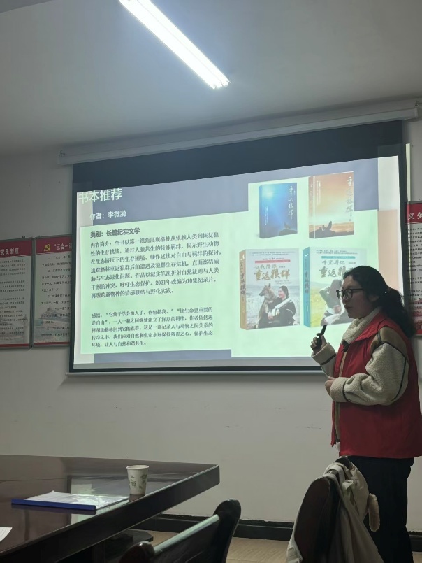 张碧莹同学带来的是作家李微漪的《重返狼群》,以真实的笔触记录下人与狼跨越物种的羁绊与救赎,让我们从中读懂真正的爱不是占有与束缚,而是尊重天性、成全自由,更懂得敬畏每一个鲜活的生命,坚守万物平等的自然初心