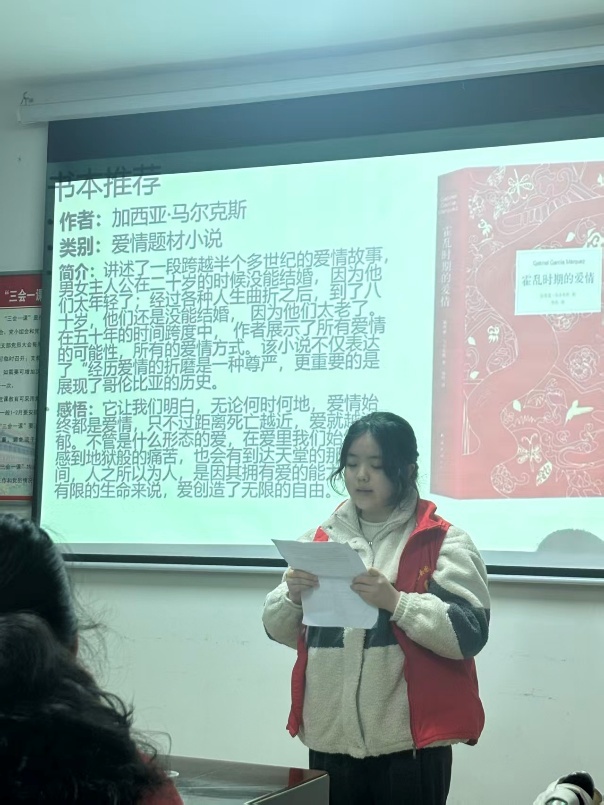 吴蕊滢同学带来的是哥伦比亚作家加西亚·马尔克斯的《霍乱时期的爱情》,以浪漫而厚重的笔触铺展跨越半个世纪的爱情史诗,在漫长的等待与坚守中,道尽爱情的千姿百态,也让我们看见时光里最执着的深情与生命最本真的模样。