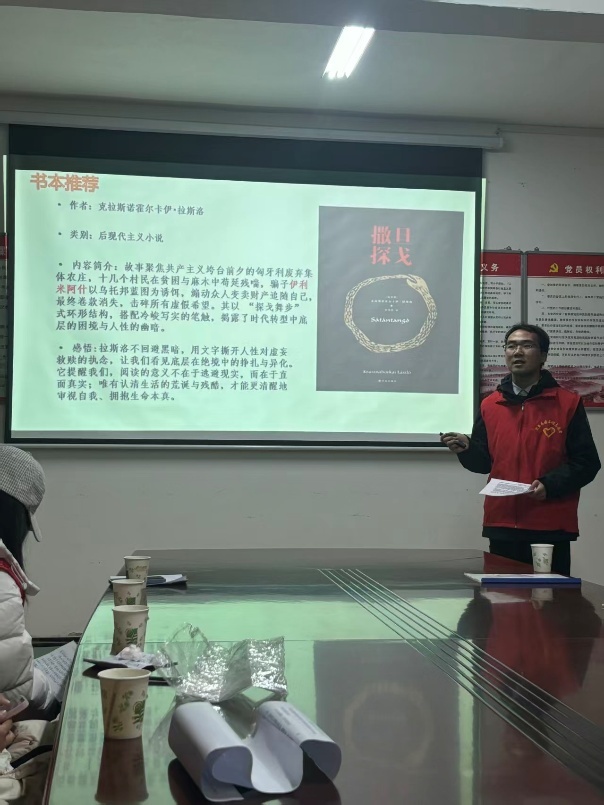 刘奔同学带来的是匈牙利作家克拉斯诺霍尔卡伊的《撒旦探戈》,以迷宫般的叙事铺展小人物在绝望中的挣扎与虚妄,在荒诞的等待与徒劳的奔逃中,映照出人性的复杂与命运的无解,藏着对世间百态的深刻洞察。