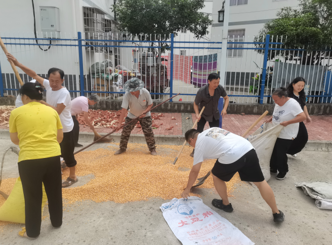 在田间地头,镇村干部同群众一道忙着采收成熟的玉米棒子,年长的老党员则在晒场上指导村民把剥下来的湿玉米粒摊成薄层晾晒……。汗水顺着人们的脸颊滑落,滴在泥土里,混着玉米叶的清香弥漫开来。