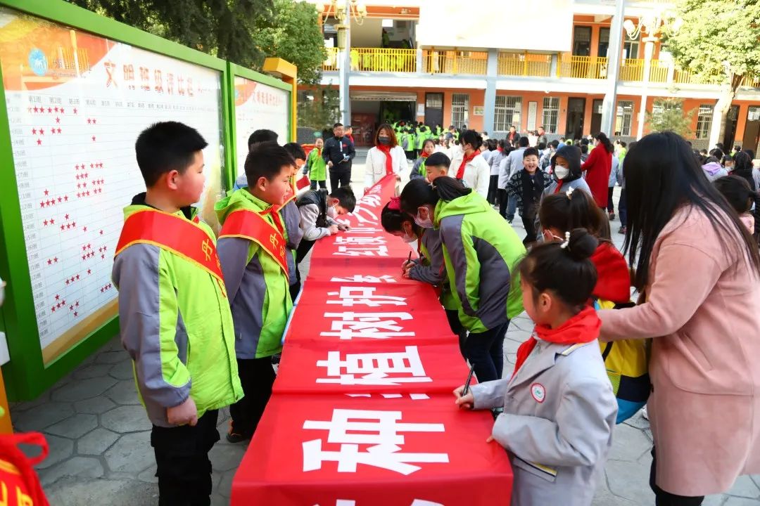 升旗中队五(2)中队发起了“栽种绿意 守护美好 植树护绿 红领巾共行动”倡议,呼吁同学们保护环境、爱绿护绿。队员们热情高涨,并在横幅上留下自己的签名。