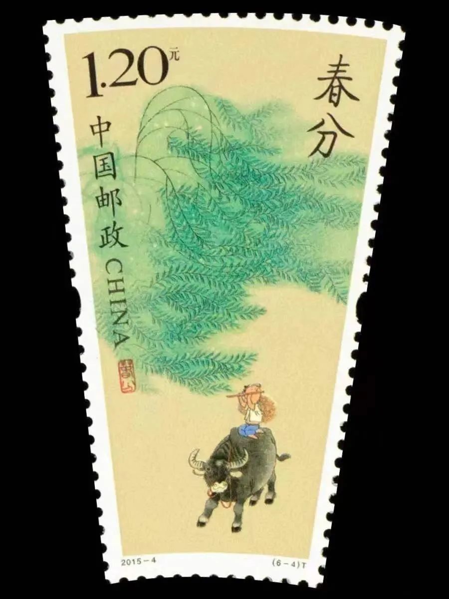 该套邮票采用中国扇面画的排列方式,采取国画小品的绘制形式,笔法轻盈、简洁明快,将艺术与生活有机地结合在一起。“春分”一枚表现出柳树飘絮、绽放春天的好气息,牧童坐于耕牛上的场景。