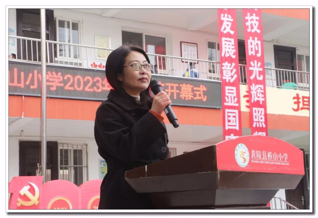 梁延琴副校长发表致辞。号召全体桥园学子插上理想的翅膀,感受科技的魅力,做到人人学科学,事事想科学,时时用科学,天天有科学。