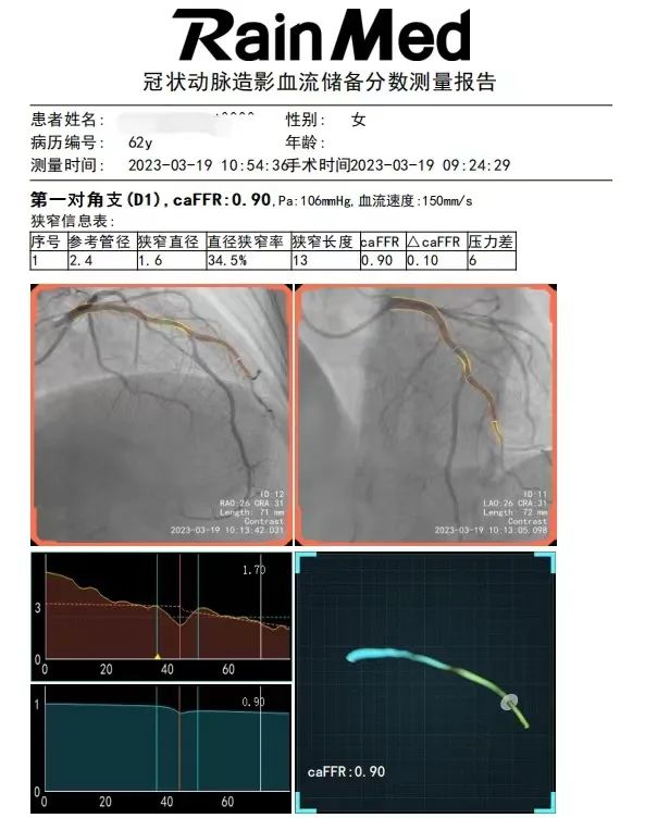 患者李XX,女,62岁,以“间断胸闷、气短6年余,咳嗽2天”入住心内科。入院诊断:冠状动脉粥样硬化性心脏病、稳定型心绞痛、心功能II级、社区获得性肺炎、高血压病、2型糖尿病、高同型半胱氨酸血症,肺部感染控制后于3月19日行冠状造影术,术中可见前降支中段70-80%狭窄,前向血流TIMI 3级;回旋支远段较细,未见明显狭窄,第一第二钝缘支粗大,第一钝缘支近段约50%狭窄,第二钝缘支近中段90-95%狭窄,前向血流TIMI 3级;右冠脉近段30-50%狭窄,中段50%狭窄,左室后支50-70%狭窄,前向血流TIMI 3级。与患者家属沟通病情并征得其同意后,在西安交通大学第一附属医院王军教授指导下,对其进行功能学caFFR检查,该检测技术操作便捷、精准、高效,整个检测过程不到10分钟,术前caFFR结果示前降支0.83,回旋支0.54,遂仅给予回旋支支架干预,PCI术后再次对回旋支行caFFR检查,结果示0.95,复查造影TIMI血流3级,支架贴壁良好,术后规律药物治疗,患者症状得到明显缓解,术后3天康复出院。